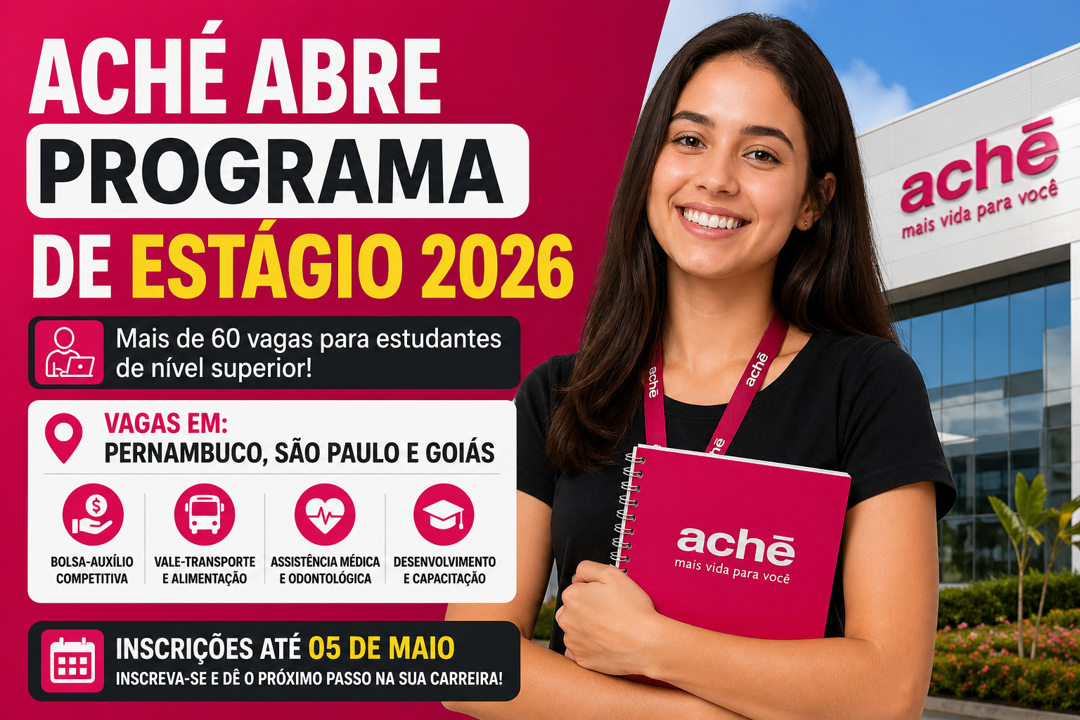 O Aché Laboratórios Farmacêuticos está com inscrições abertas para o seu Programa de Estágio 2026, oferecendo mais de 60 vagas para estudantes de nível superior. As oportunidades são para atuação em Pernambuco, São Paulo e Goiás.