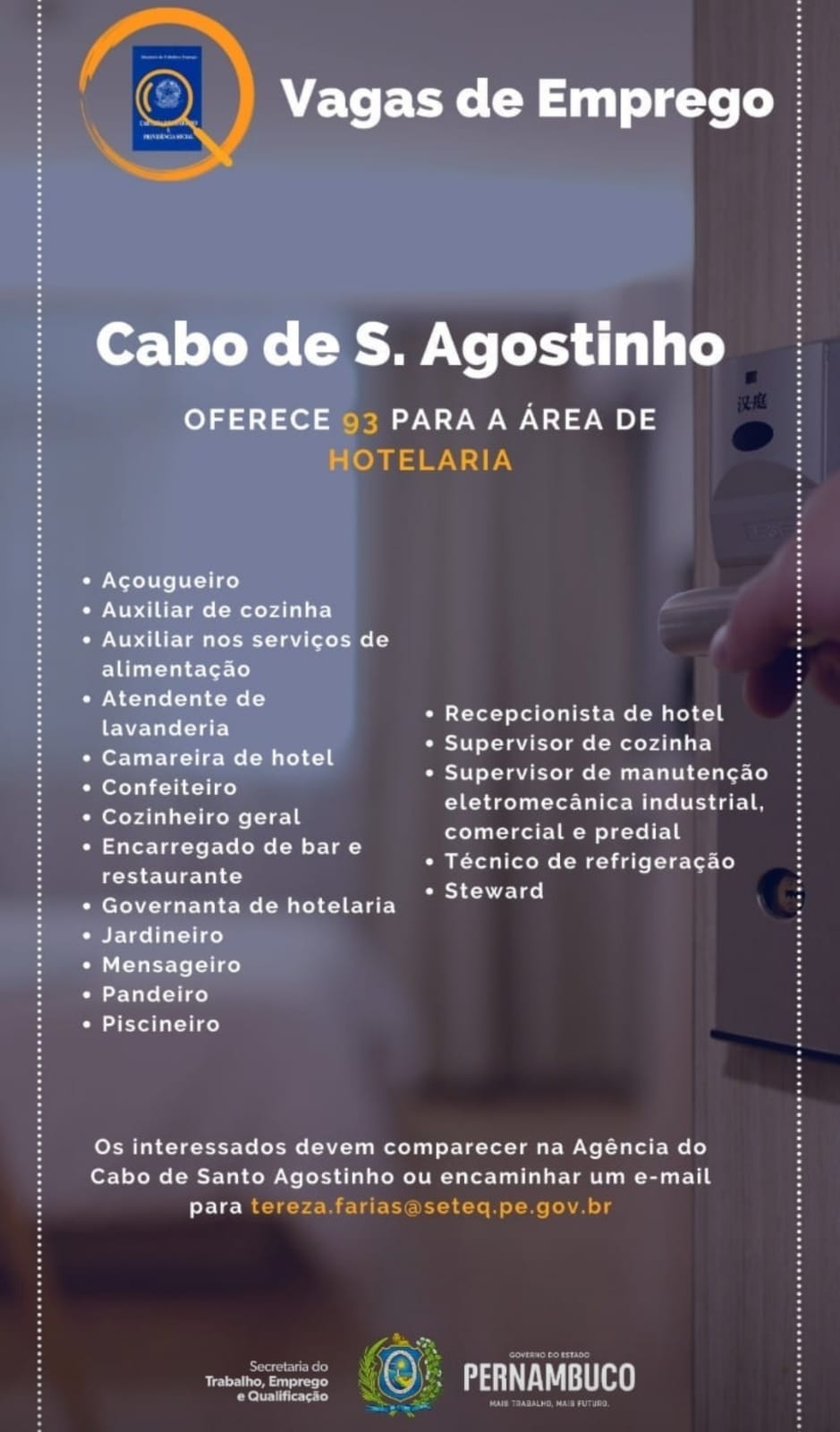 Cabo de S. Agostinho OFERECE 93 PARA A ÁREA DE HOTELARIA