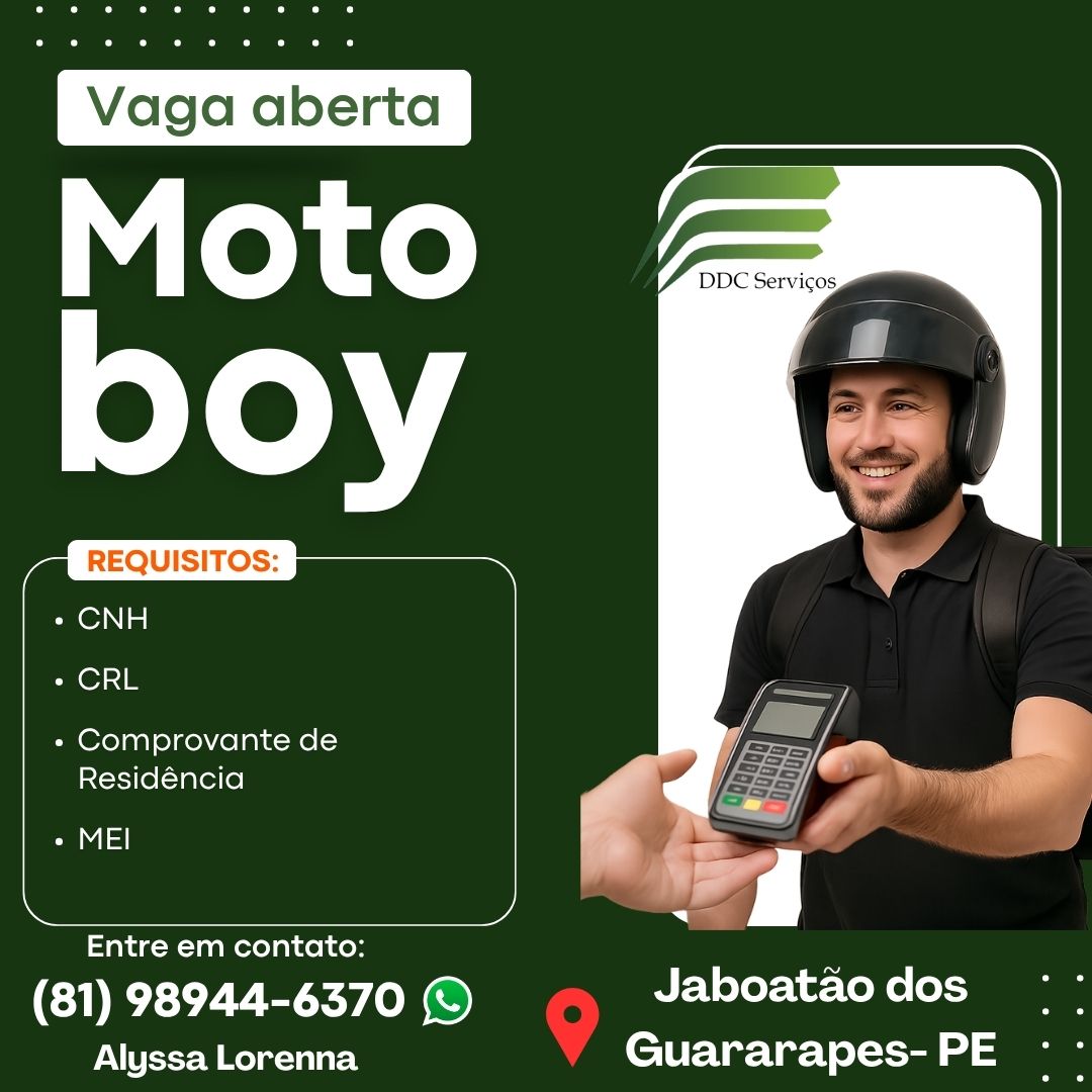 Enviar seus currículos para o email CONTATO.LCMCONSULTORIA@GMAIL.COM e RH.DDCSERVICOS@GMAIL.COM com o título MOTOBOY - JABOATÃO DOS GUARARAPES até 12/10/2025.